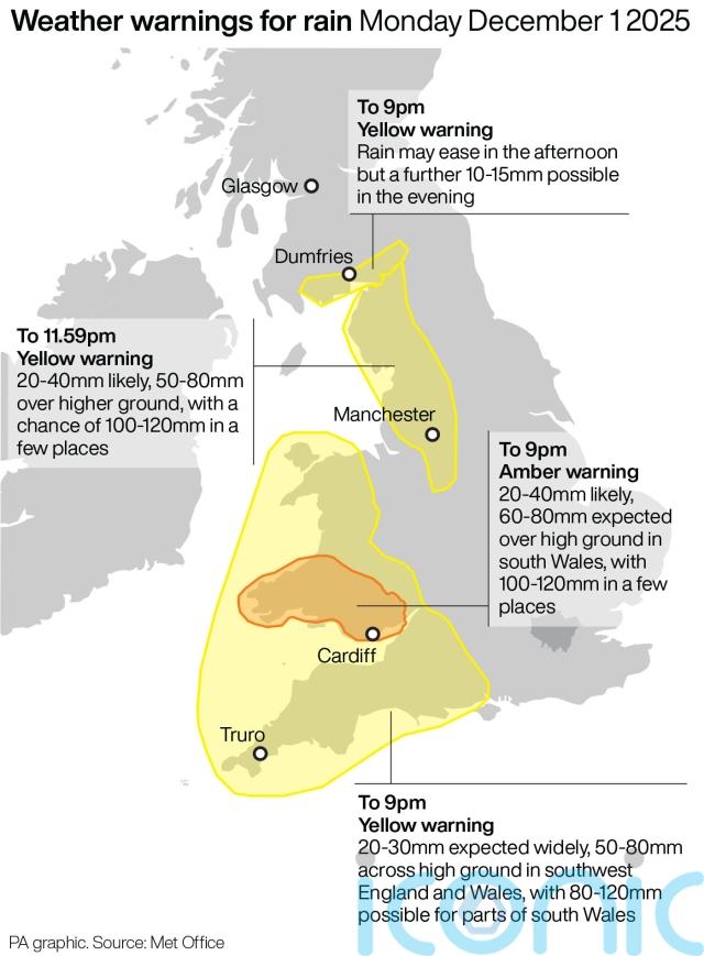 Forecasters predict 120mm of rain could fall in the highest ground of Wales’ amber warning zone, while 20mm to 40mm is expected widely and up to 80mm is likely in hilly parts.