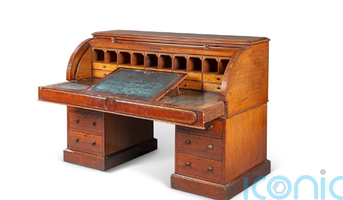 The author’s mid-Victorian roll-top mahogany and satinwood desk will be offered at Christie’s on December 11 with a guide price of £50,000 to £80,000.