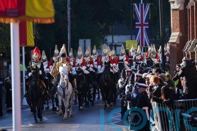 In the bright, cold December sunshine, the royal party and their guests took part in a colourful carriage ride through the streets of the Berkshire town, led by a Sovereign’s Escort from the Household Cavalry Mounted Regiment.