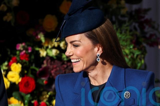Kate was wearing a blue coat by Sarah Burton for Alexander McQueen, with a matching hat, her hair down and straight, and earrings which belonged to William’s late mother, Diana, Princess of Wales, and a Prince of Wales Feathers brooch.