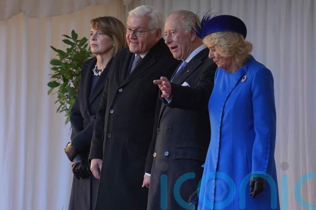 A 41-gun royal salute was fired from the East Lawn within Windsor Home Park, timed with military precision to coincide with the King and Camilla greeting their guests at midday, before they introduced them to local dignitaries and joined them for the playing of the German national anthem.