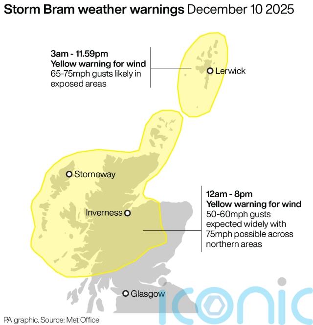 Three yellow weather warnings for wind are active until Wednesday evening covering the Shetland Islands, Central, Tayside and Fife, Grampian, and further south in Scotland, including Edinburgh and Glasgow.