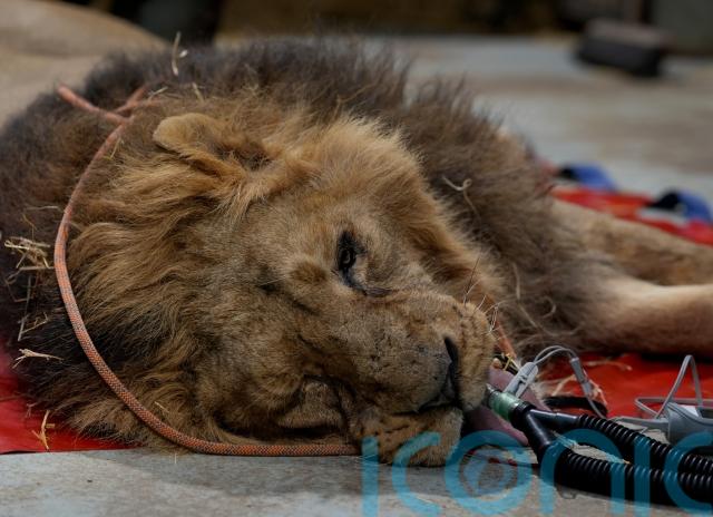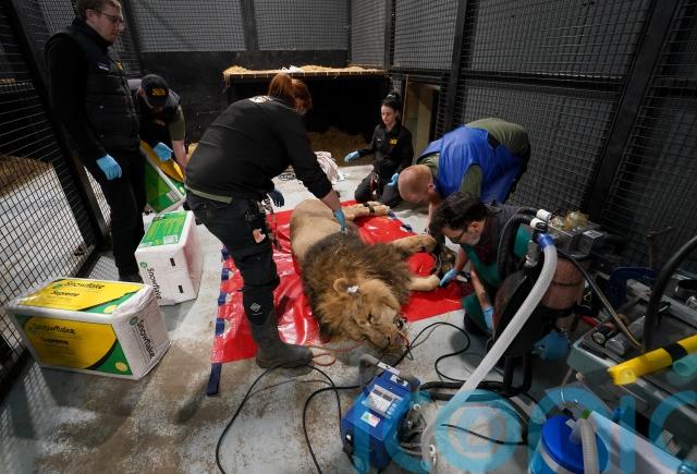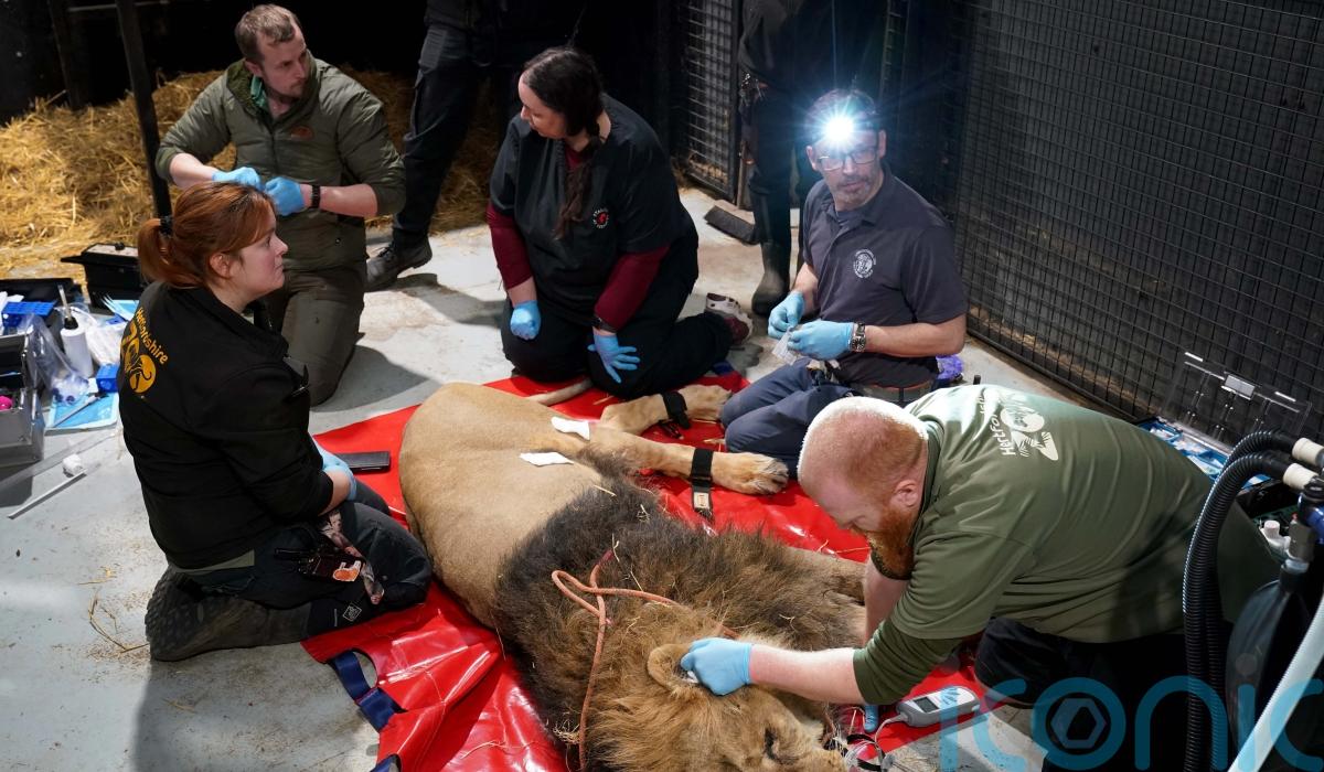 A lion involved in a “critical” international breeding programme was pictured having a “vital” health check under general anaesthesia.