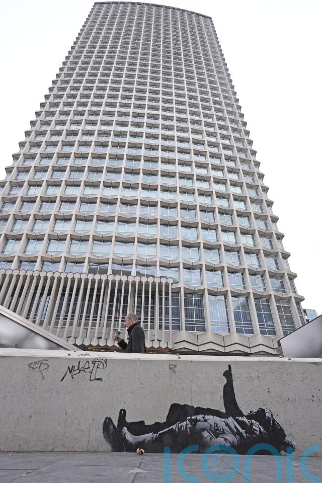 Two people lie on the ground looking up at a London skyscraper in the latest artwork thought to be by graffiti artist Banksy.