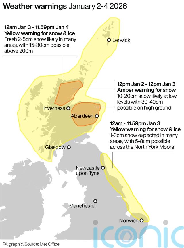 A Met Office yellow warning is already covering the country as far south as Angus and Perthshire while two separate amber warnings of heavy snow in part of the Highlands and north-east Scotland come into force at midday on Friday.