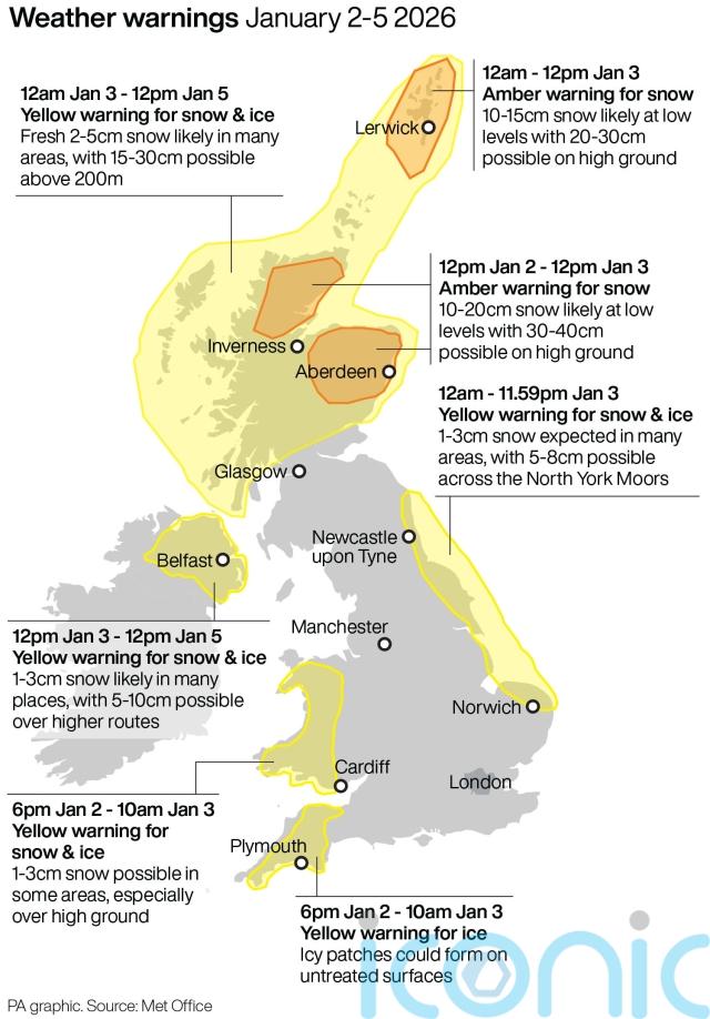 Two separate Met Office amber warnings for heavy snow in part of the Highlands and north-east Scotland came into force at midday on Friday, while a yellow warning of snow and ice covers the country as far south as Angus and Perthshire.