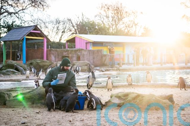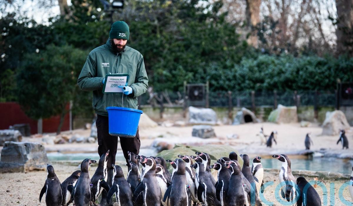 Among the animals counted were the zoo’s 75 Humboldt penguins, who gathered around their keeper to get their fish supper as they were ticked off one by one.