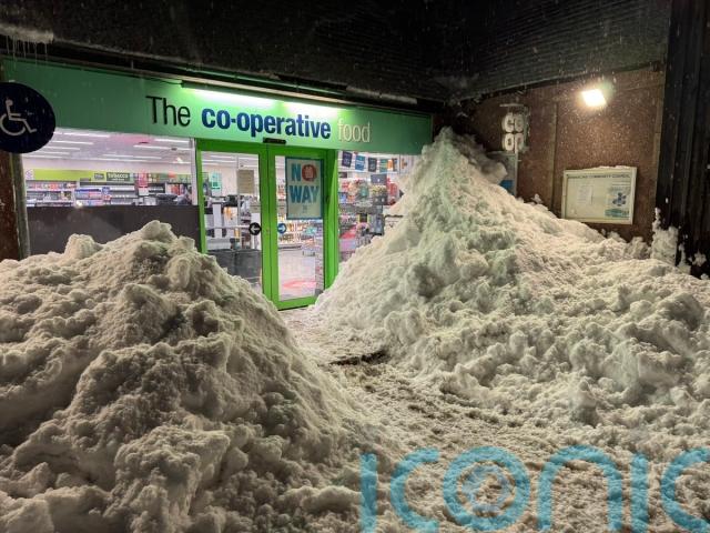 He said that a snow plough had cleared the entrance to the local Co-Op, which he photographed on Tuesday evening with piles of snow reaching almost to the roof.