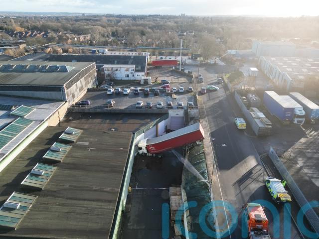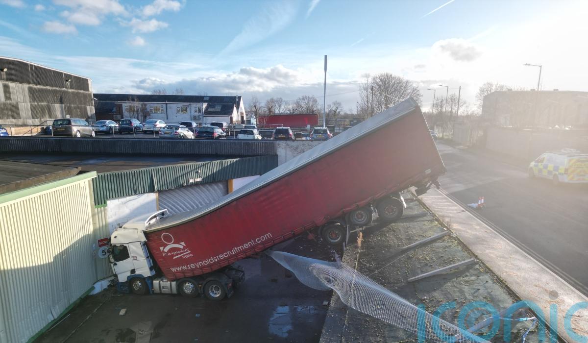 Pictures of the scene show the rear end of the lorry’s trailer bent upwards on a steep slope while the cab had gone through the fence and ended up near a warehouse building.