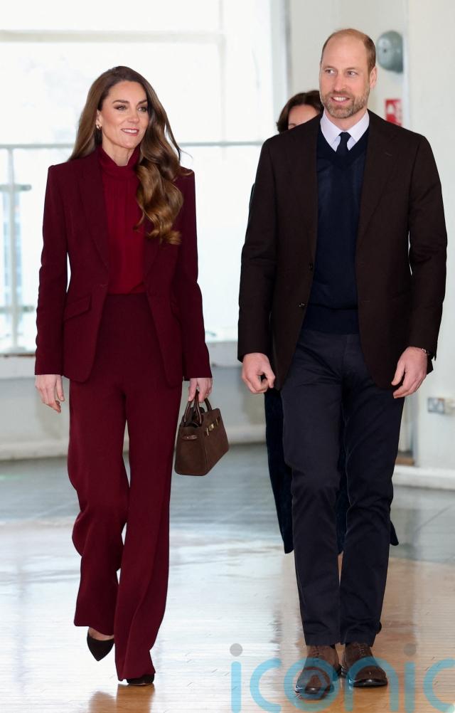 Kate, who wore her hair down and carried a small handbag, was dressed in an on-trend burgundy trouser suit with matching blouse, while William wore a V-neck jumper over his shirt and tie, with his suit jacket.
