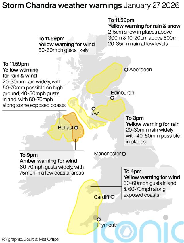 Storm Chandra was also bringing disruption to other parts of the south west, the south coast, and north of England, as well as Wales, Scotland and Northern Ireland.