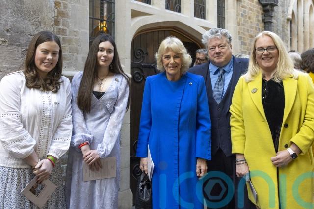 Camilla was wearing a blue silk dress, with a blue cashmere top stitch coat by Anna Valentine and a Dior handbag.