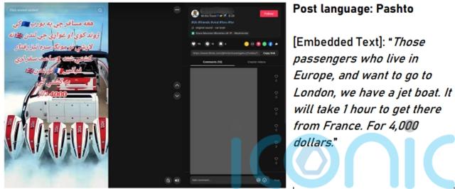 A TikTok post, written in Pashto, offered a one-hour “jet boat” from France to London at a cost of 4,000 dollars, according to a Government translation.