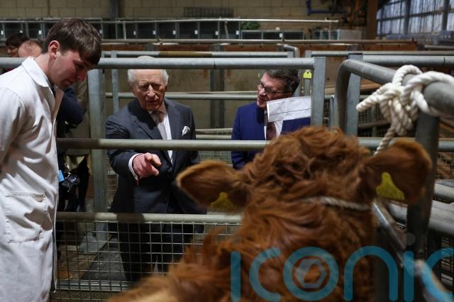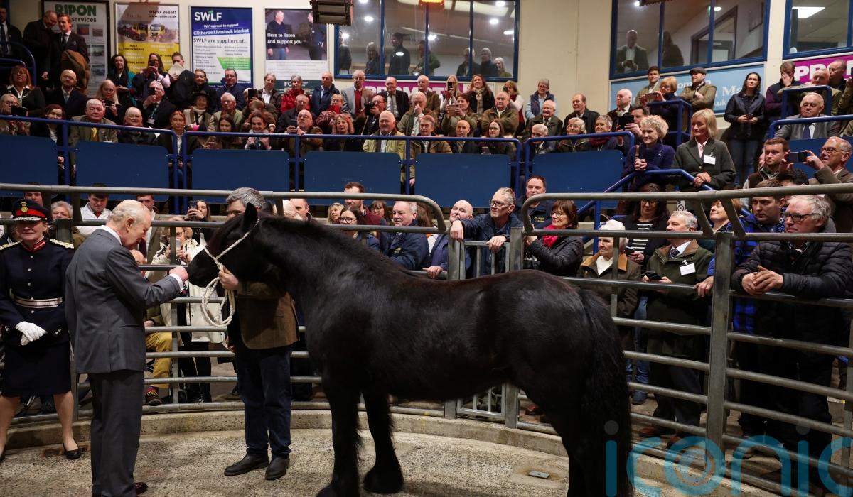 The King met a relative of the late Queen’s beloved pony Emma, as he received a warm welcome at an auction mart in Lancashire.