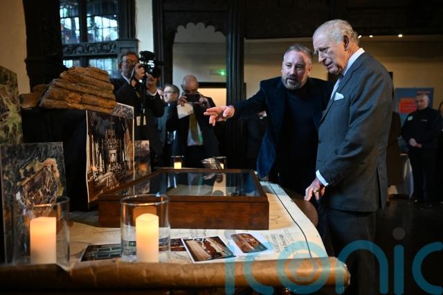 Jason Karl, a trustee and volunteer, showed the King several artefacts, including a large piece of oak timber dating back to 1325 that formed part of the hall’s original structure.