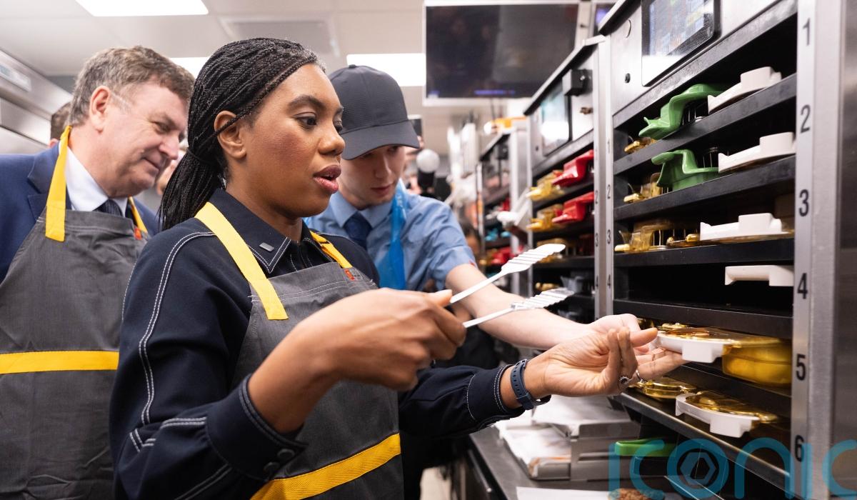 Kemi Badenoch has returned to a McDonald’s kitchen 30 years after working at the fast food restaurant as a teenager.