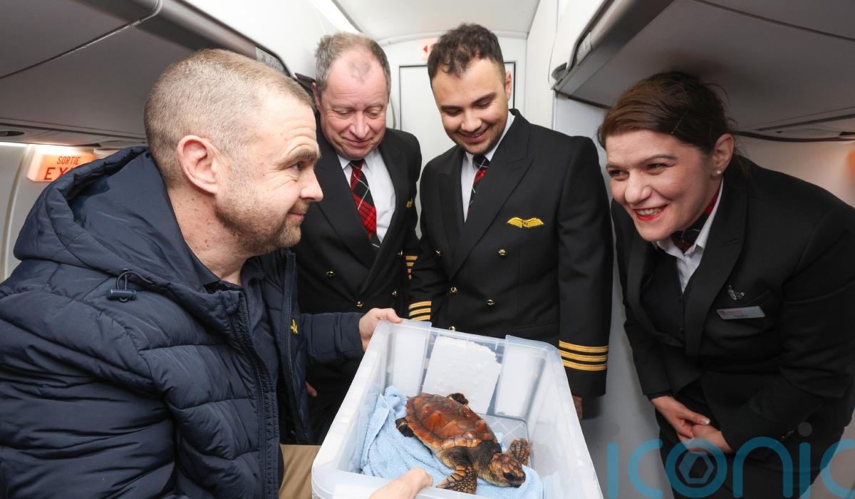 A rescued turtle has been flown in an airliner’s passenger cabin because a sea crossing was deemed too stressful.