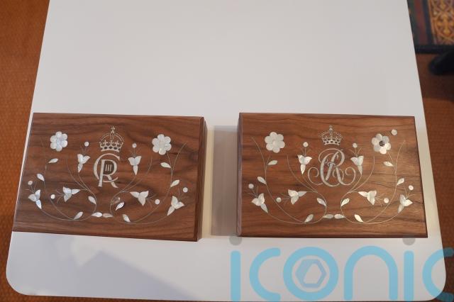 Charles and Camilla were invited to apply the finishing touches by placing the final pieces of mother of pearl onto their respective boxes.