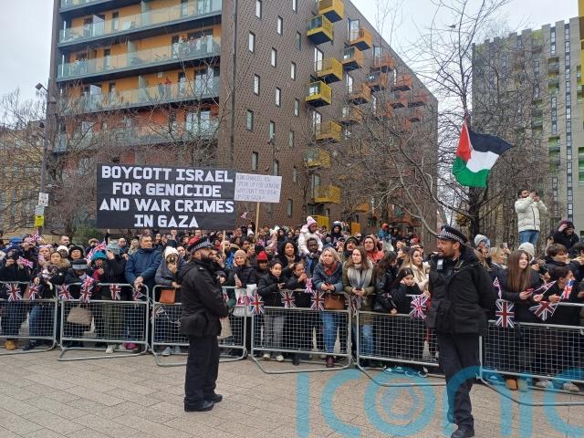 They ended their 30-minute trip to the Barking Learning Centre Community and Family Hub with a walkabout where a small group of protesters shouted “free free Palestine” from the waiting crowd.