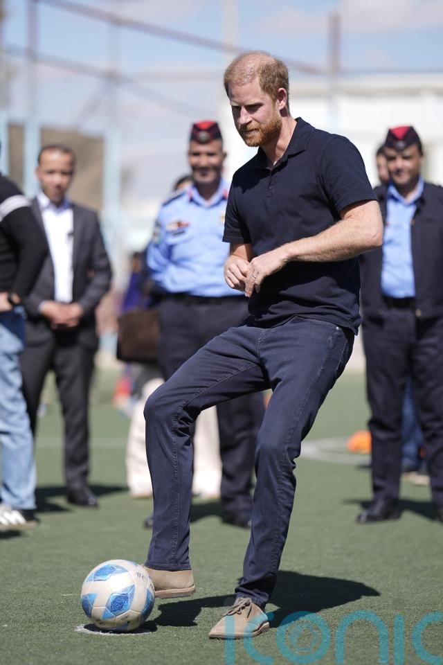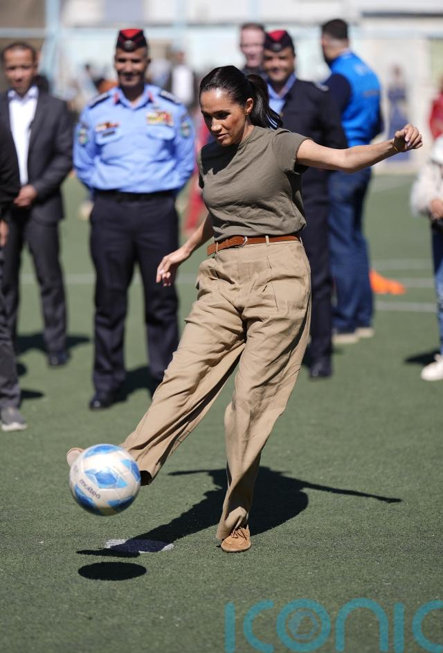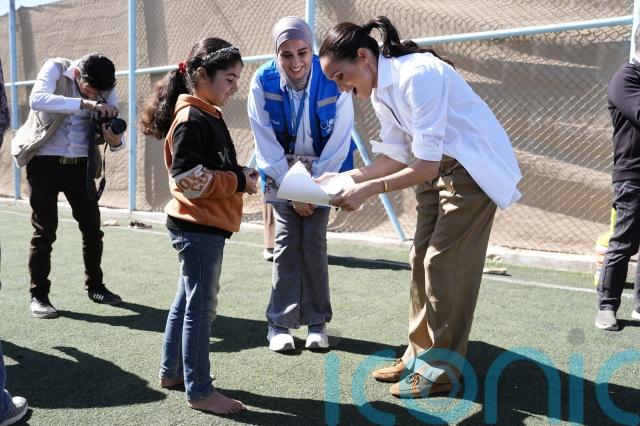 The Duchess of Sussex was left with bragging rights when she scored a penalty and her husband’s shot was saved when they joined Syrian children at a refugee camp.