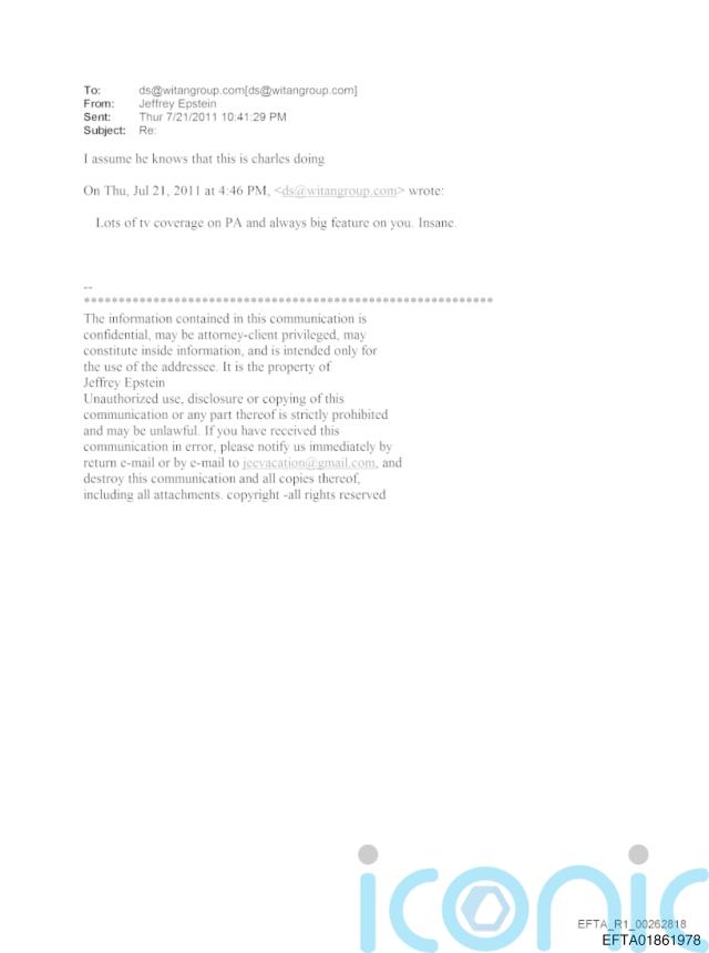 In an email dated July 21 2010, released as part of the US Department of Justice’s document dump related to Epstein last month, an exchange saw the convicted sex offender write: “I assume he knows that this is Charles doing.”