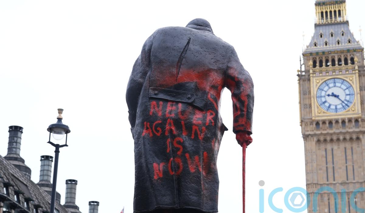 Other phrases including “Stop the Genocide” and “Free Palestine” were sprayed in red paint on the bronze sculpture in Parliament Square, Westminster.