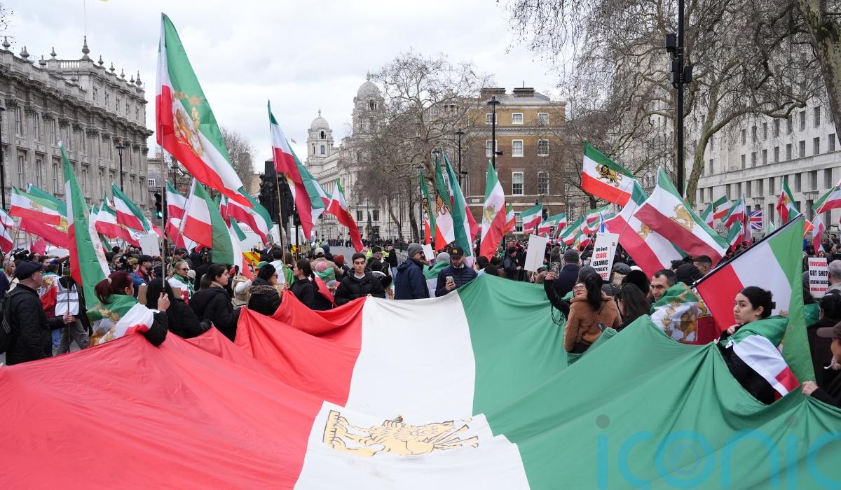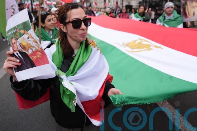 The group gathered outside Downing Street, where many held placards displaying photographs of Iran’s exiled crown prince, Reza Pahlavi, before marching through Whitehall.