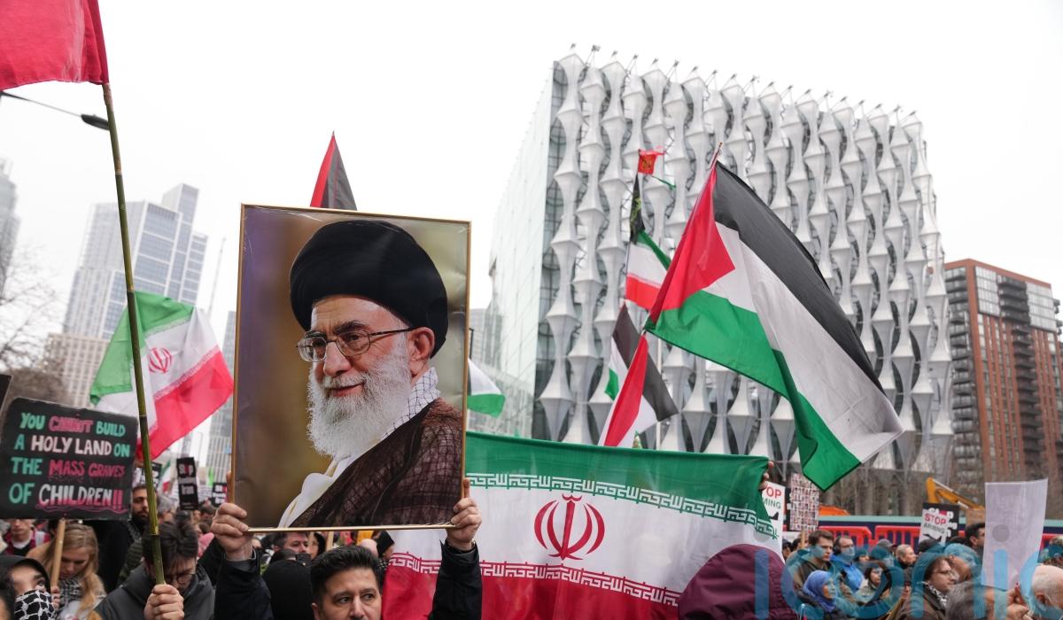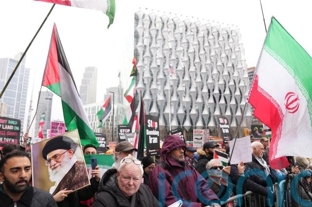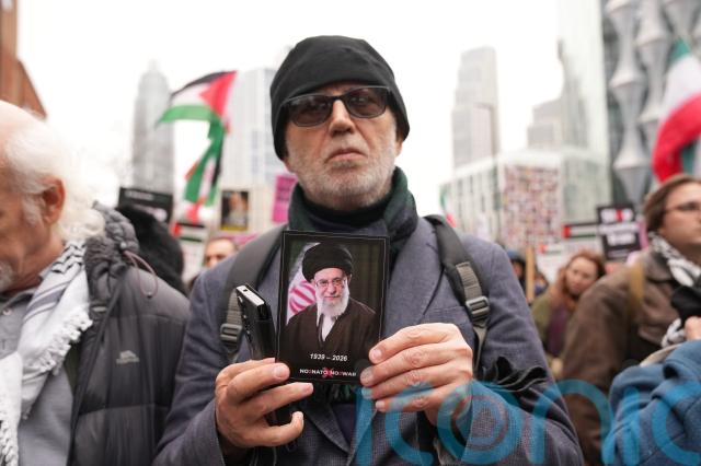 Many protesters were carrying Iranian and Palestinian flags as well as portraits of Iran’s former supreme leader Ayatollah Khamenei, who was killed in the opening strike of the war last Saturday.