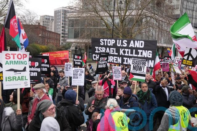 Some waved placards reading “Stop Trump’s Wars”, “Stop the War on Iran”, “Stop Arming Israel” and “No War on Iran”.