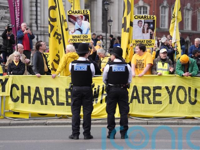 There was a large anti-monarchy protest opposite the Abbey, with demonstrators holding “Not My King” and “Abolish the Monarchy” banners.