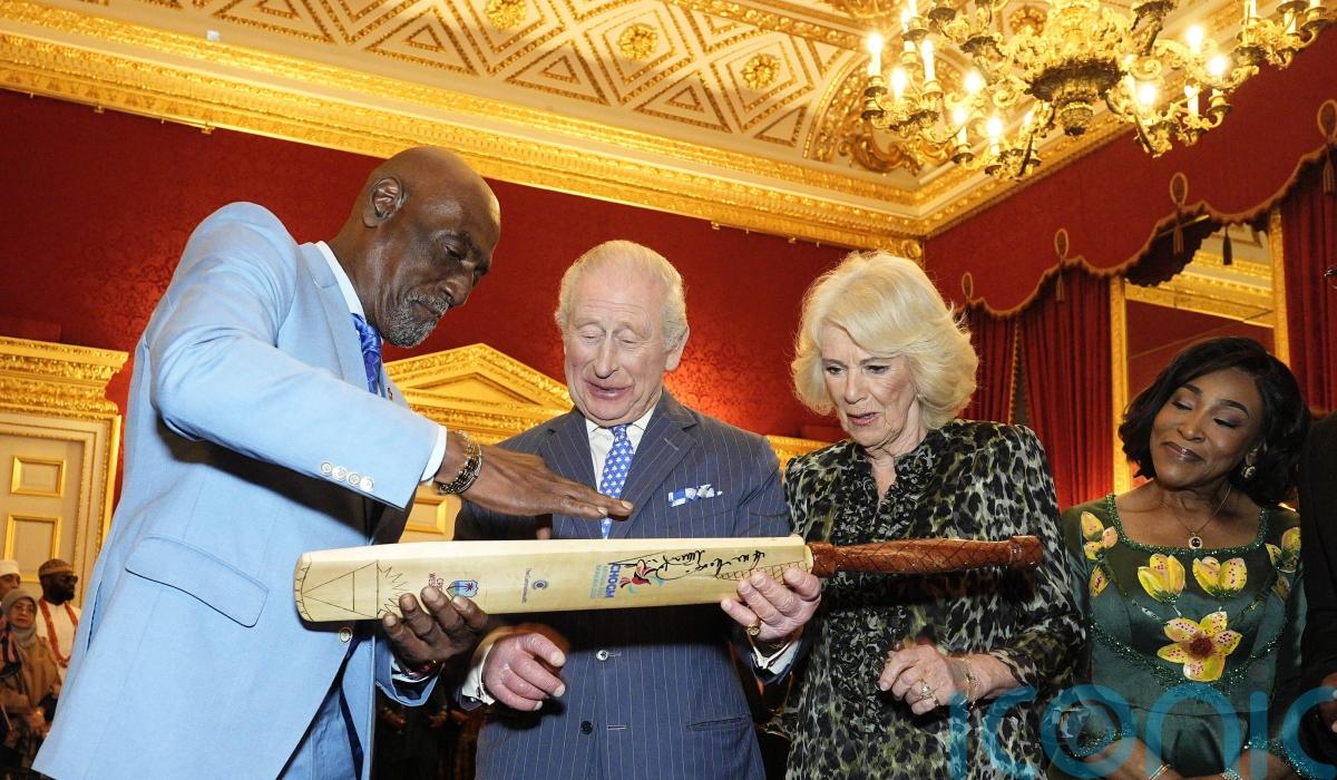 Charles was presented with the bat by the former West Indies captain at the annual Commonwealth Day reception at St James’s Palace, which saw the King and Queen meet ministers and dignitaries from across the 56 Commonwealth nations.