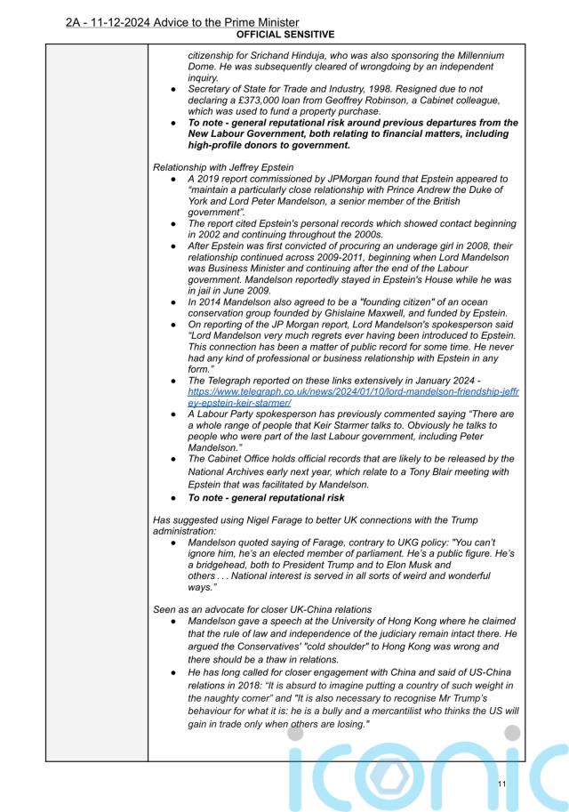 But papers published on Wednesday showed a due diligence document drawn up by the Cabinet Office in December 2024 over the appointment noted a series of reports detailing his links with the convicted sex offender.