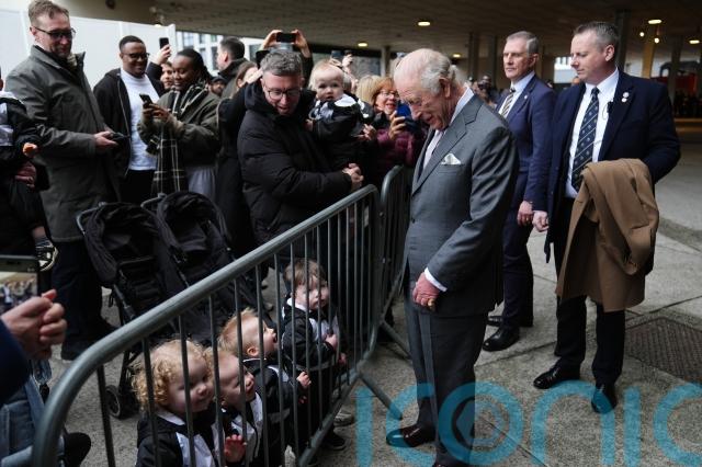 The King spoke briefly to members of the public who gathered outside the city-centre venue including child-minder Jodie Pownall, from New Mills, Derbyshire, who brought along one-year-old twins Teddy and Kuba, two-year-old Jackson, and Ronnie, Stevie and George, all aged one.