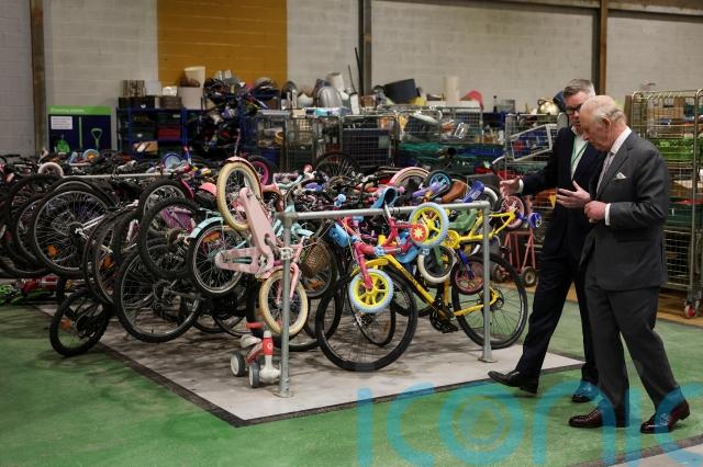 The King viewed the thousands of items salvaged from local council dumps which will now be repurposed, including thousands of electrical items, bicycles, vacuum cleaners and all types of furniture.