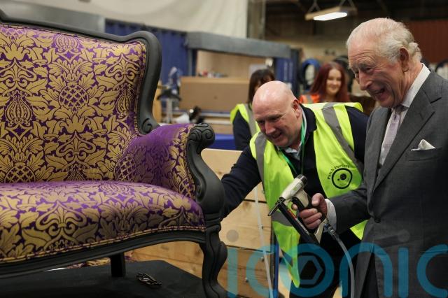 Paul Cunliffe, 56, from Winstanley, Wigan, teaches volunteers about the craft of upholstering and renewing furniture and invited Charles to use the staple gun.