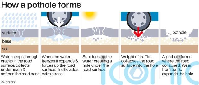 Potholes are often formed when rainfall enters cracks in the road and – when the temperature drops below 0C – freezes and expands, creating bigger cracks.