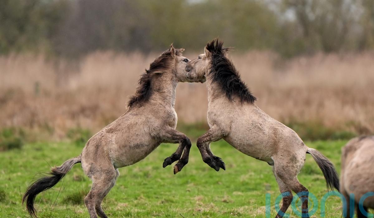 Photographs show two stallions rearing up on their hind legs and sparring with each other at a nature reserve.