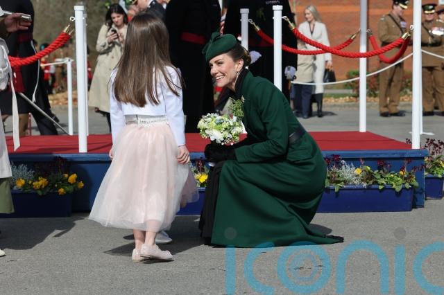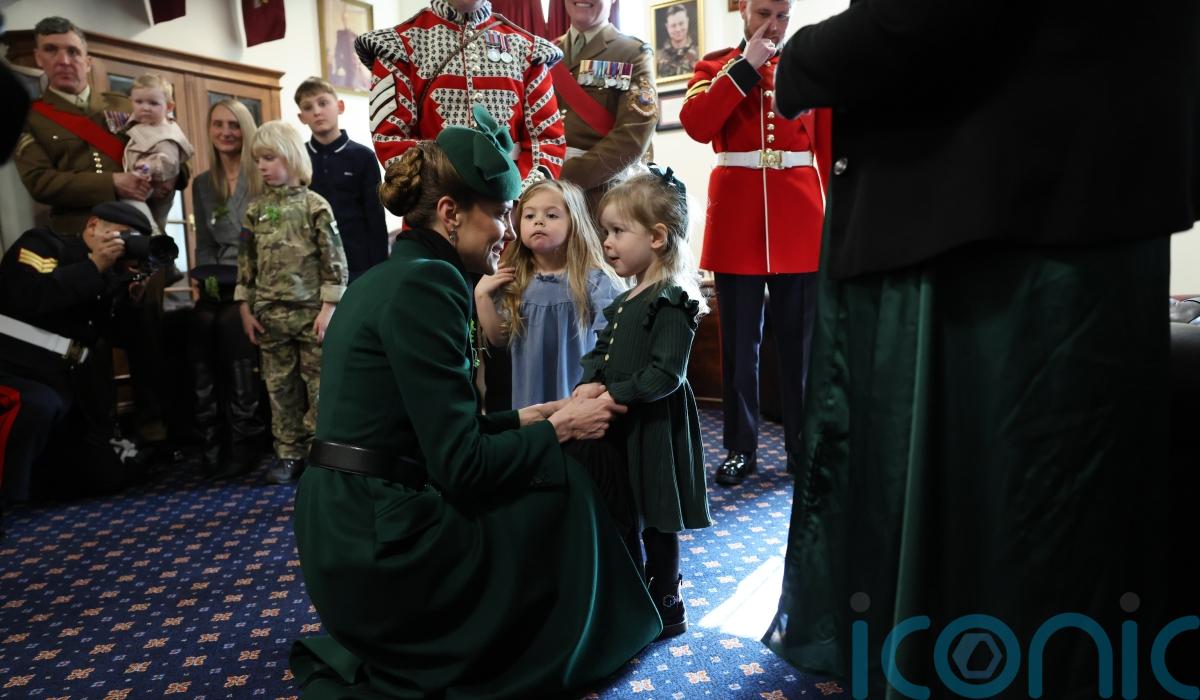 The Princess of Wales laughed as she held hands with the three-year-old daughter of a soldier serving in the Irish Guards, after attending the regiment’s annual St Patrick’s Day Parade.