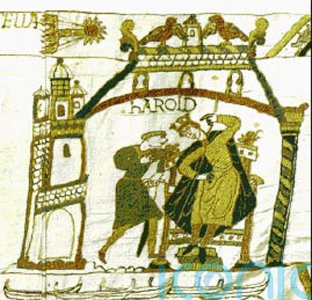 Harold’s death in the Battle of Hastings is depicted in the Bayeux Tapestry, which shows him clutching an arrow to his eye.