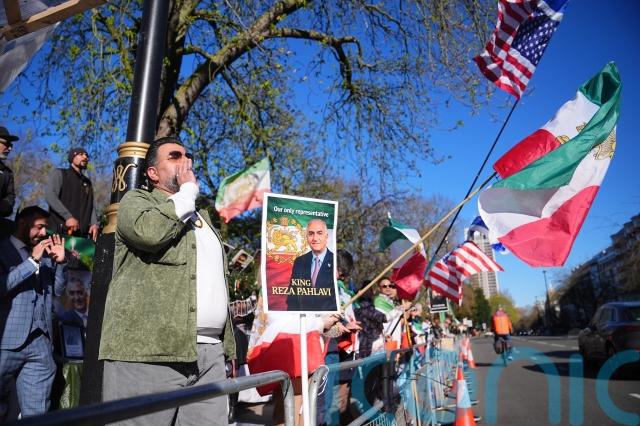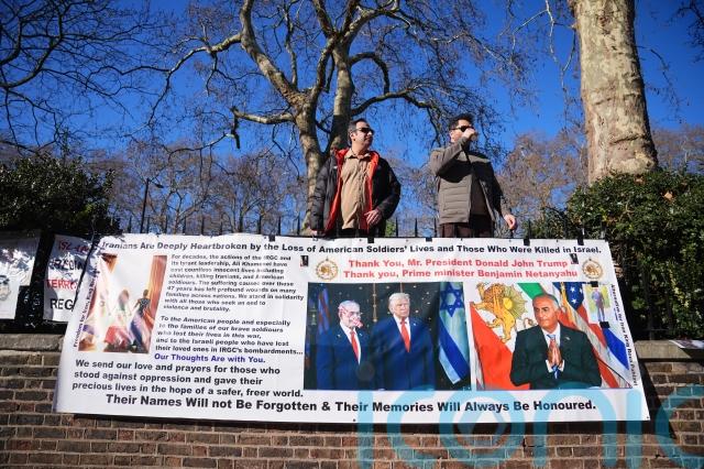 Demonstrators waved Iranian, American and Israeli flags and shouted “UK Government, shame on you, shame on you”, “Israel, USA, thank you, thank you”, and “shut the Islamic terrorist embassy”.
