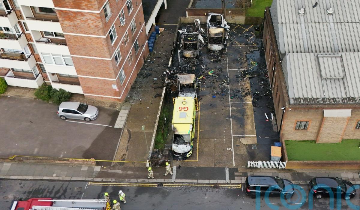 Gas canisters kept in the ambulances exploded after they were set alight at the site in Highfield Road, Golders Green, north-west London, around 1.45am on Monday, but no injuries have been reported.