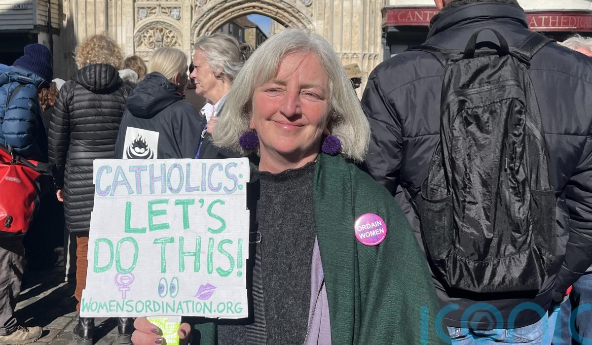 Jane Varner Malhotra, 57, from Washington DC, held a sign that read “Catholics, let’s do this” outside Canterbury Cathedral in Kent on Wednesday afternoon ahead of the service to mark the beginning of Dame Sarah Mullally’s ministry.