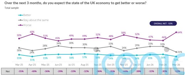The British Retail Consortium (BRC) survey by Opinium, taken between March 10 and March 13, shows consumer expectations of the economy over the next three months fell to its lowest level on record, plunging to minus 53 from minus 30 in February.