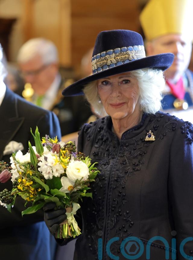 Camilla wore a hat by Philip Treacy, a navy blue silk crepe pleated dress and navy blue wool crepe embroidered coat, both by Christian Dior, and accessorised with a sapphire and diamond brooch which belonged to the late Queen.