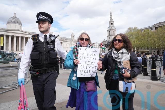 Hundreds of protesters have gathered in Trafalgar Square with signs reading “I oppose genocide. I support Palestine Action”.