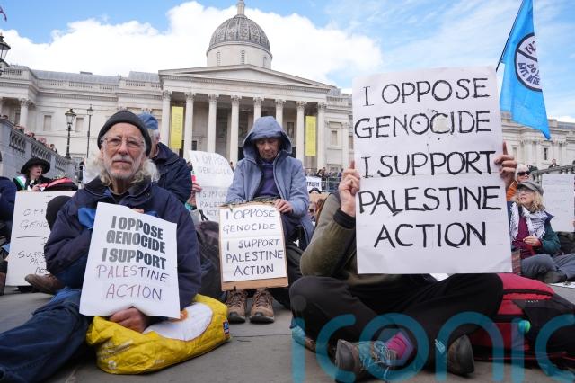 Protesters congregated in Trafalgar Square on Saturday afternoon, sitting on camping chairs and on the ground as many held up placards that read: “I oppose genocide. I support Palestine Action.”