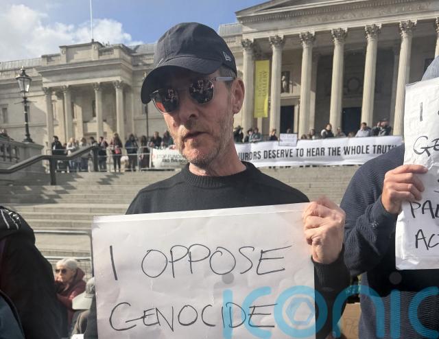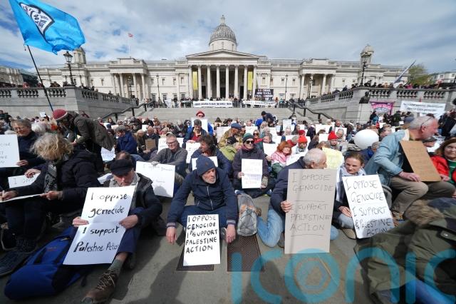 Hundreds of protesters gathered in Trafalgar Square on Saturday afternoon with signs reading “I oppose genocide. I support Palestine Action”.