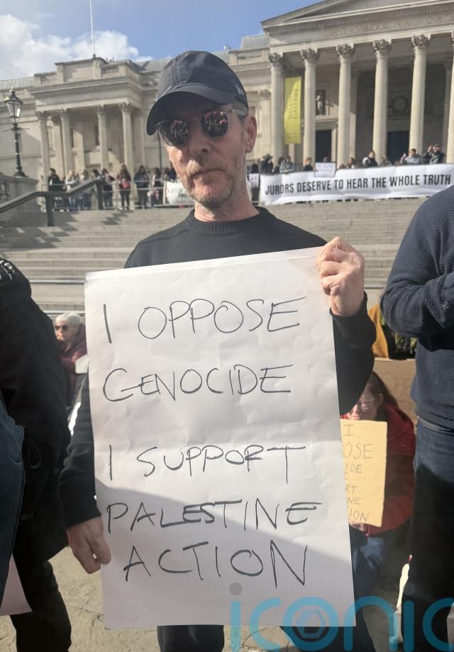 Hundreds of protesters gathered in Trafalgar Square on Saturday afternoon with signs reading “I oppose genocide. I support Palestine Action.”