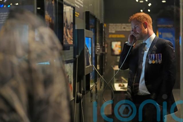 Harry seemed particularly interested in an exhibition on the Ukraine War and picked up a headphone to listen to part of the exhibit.