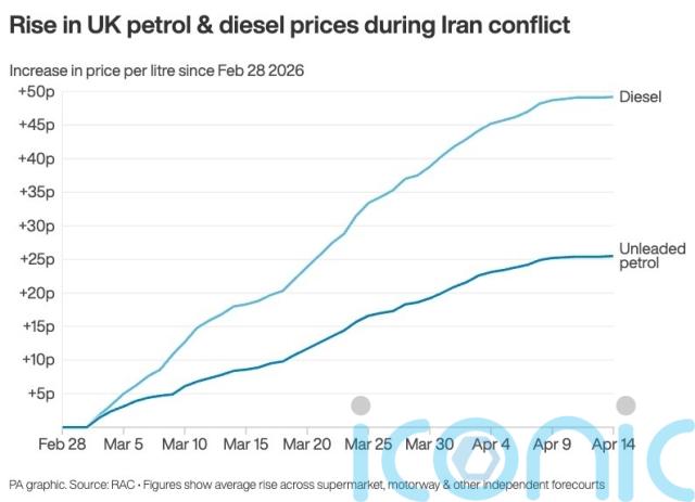 The average price of a litre of petrol and diesel at UK forecourts has increased by 26p and 49p respectively since the start of the conflict in the Middle East on February 28.
